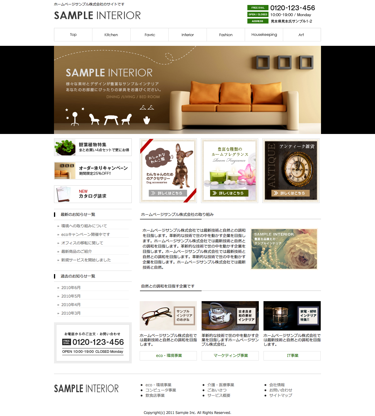インテリアショップ向けのワードプレス(WordPress)テーマです。落ち着きのあるシンプルなデザインですので美容院やその他のショップ・店舗でもご利用可能なテンプレートとなっております。
